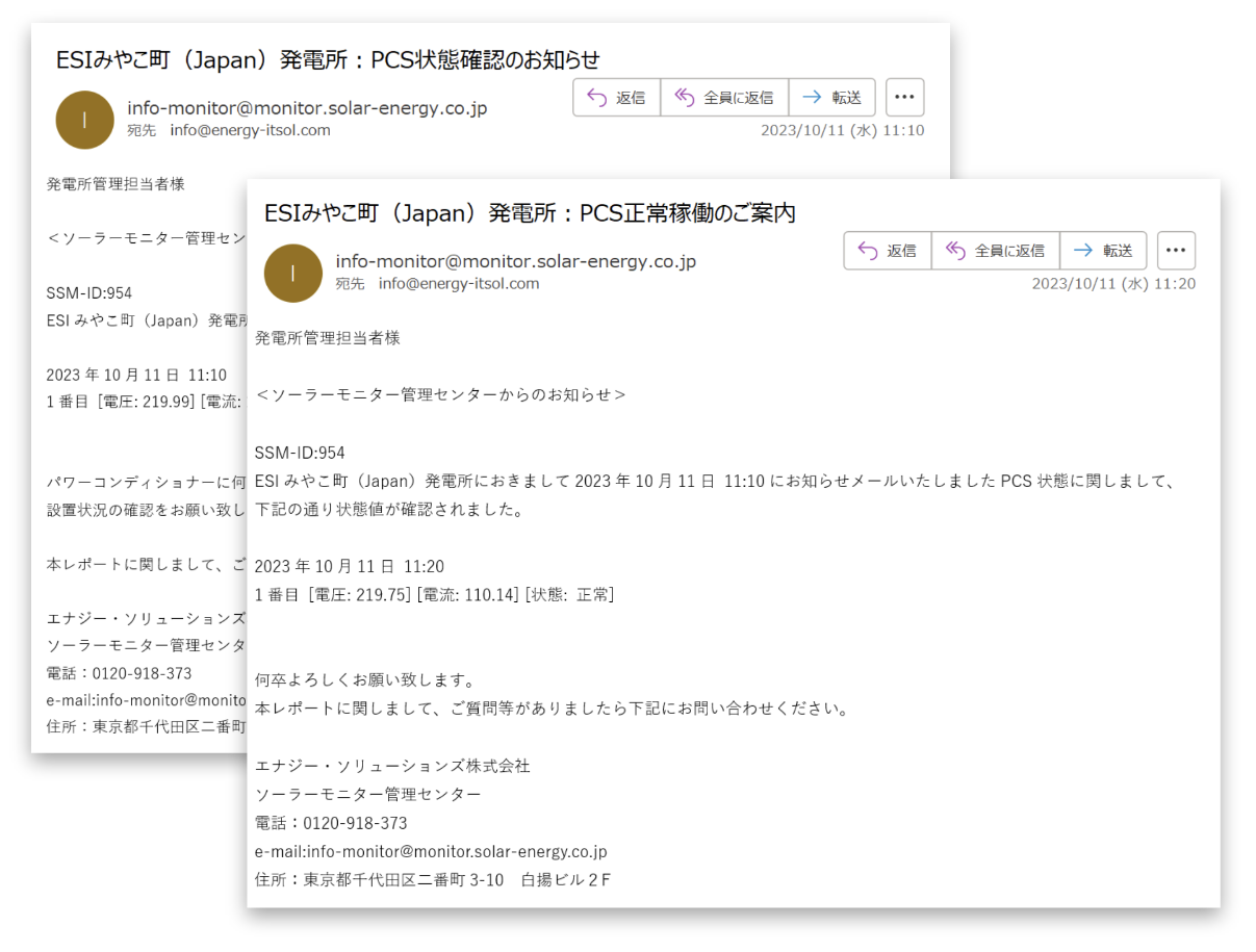 PCSの各種情報から、特許取得のアルゴリズムにより発電監視を行い、異常時にはメールでアラートを送信します。
