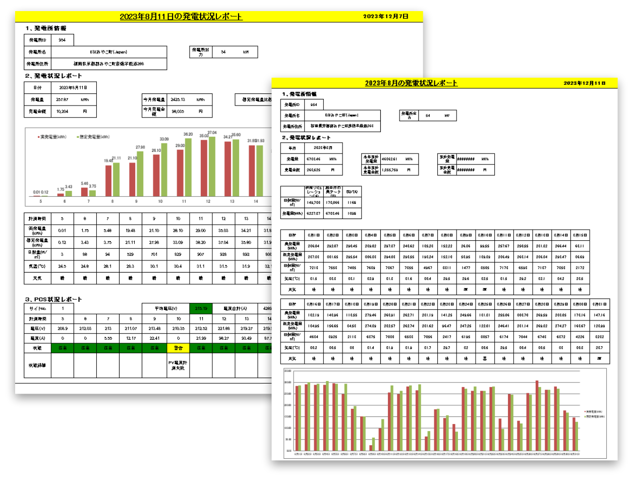 日次・週次・月次・年次の発電レポートを自動でメール配信します。発電レポートはExcel・CSV形式での出力も可能ですので、報告書などの書類の作成にもご活用いただけます。