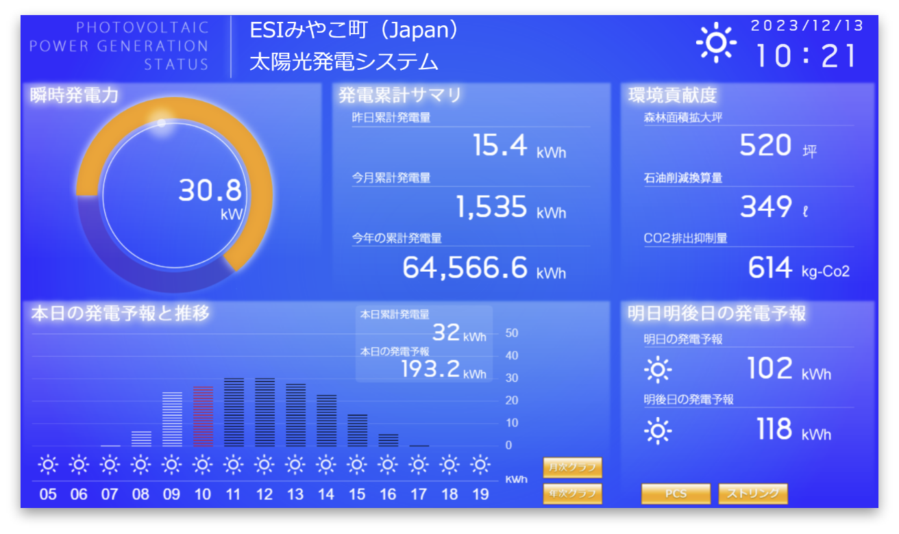 現在の発電状況や天気予報から算出した発電予報、PCSごとの発電状況などが確認できます。