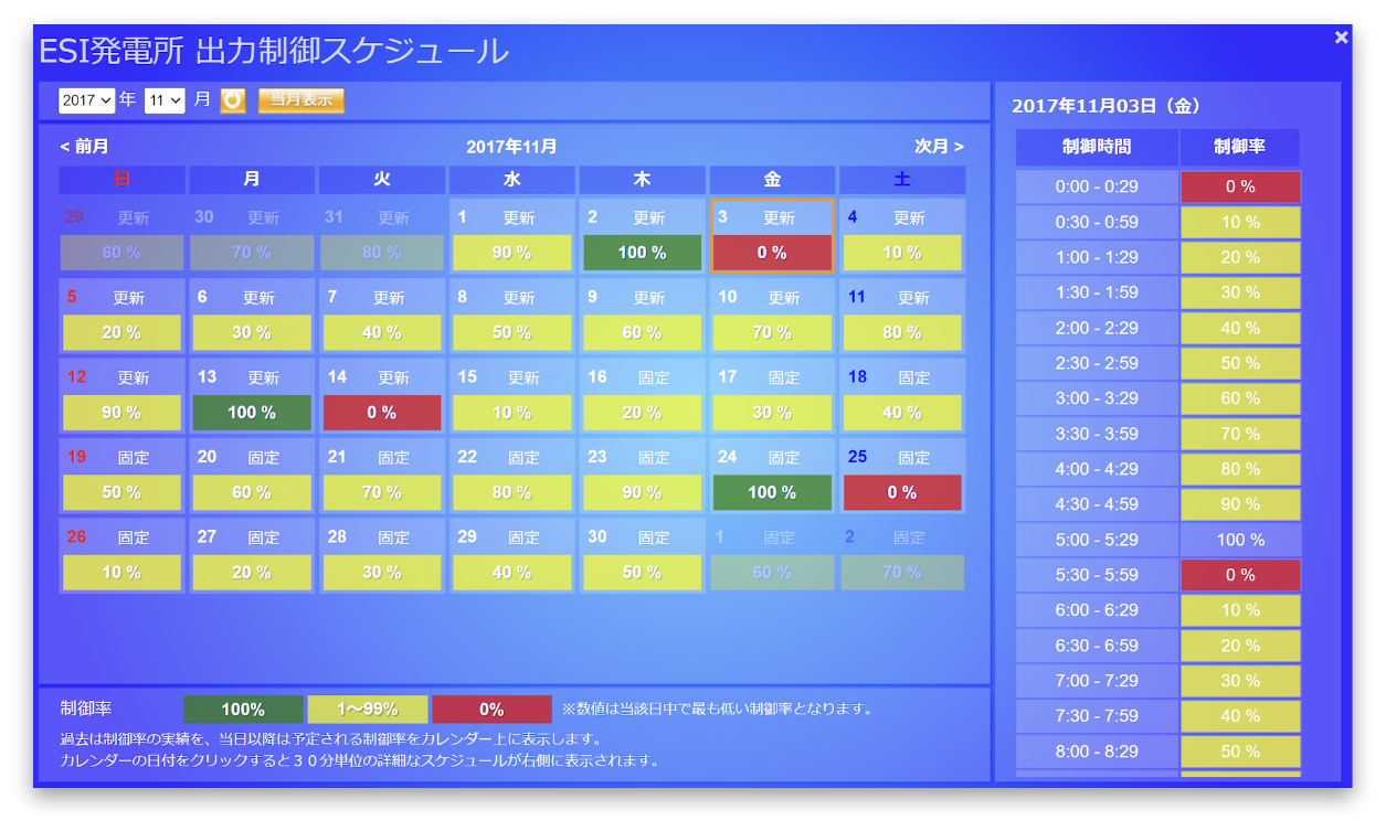 日にちをクリックすると、30分ごとの出力制御スケジュールが確認できます。