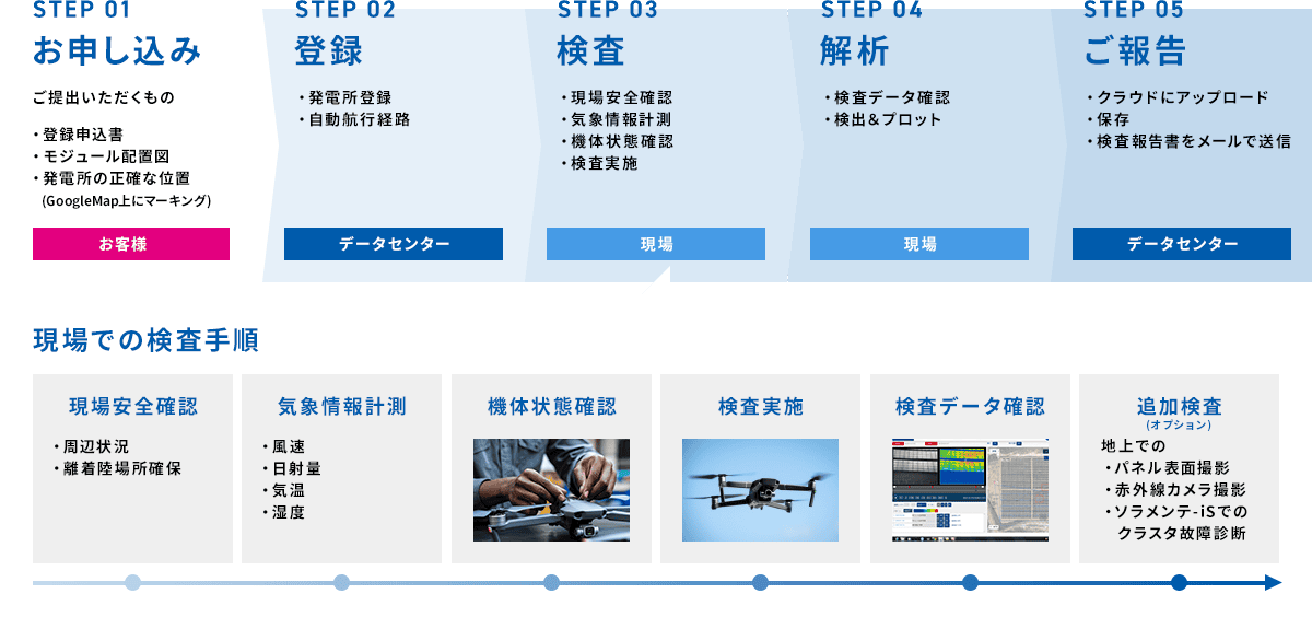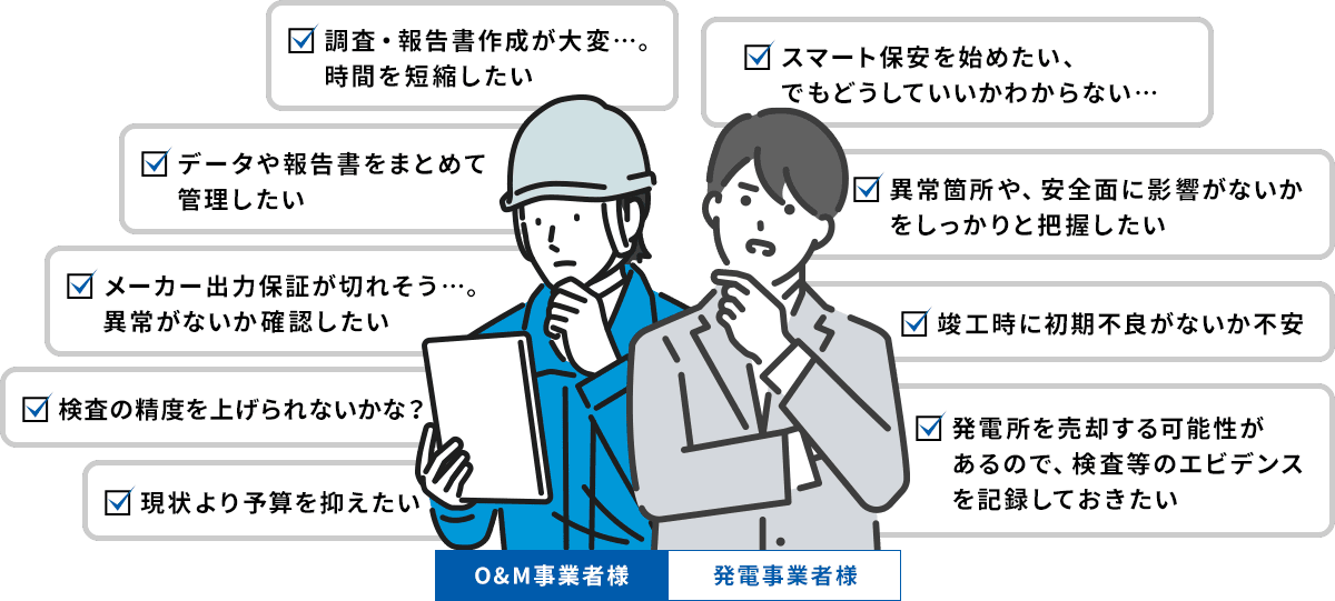 全ストリングを電流測定し管理していたが異常検出に時間がかかる。また、落雷やガラス割れも頻発する発電所のため、短期間で全モジュールを検査してほしい。