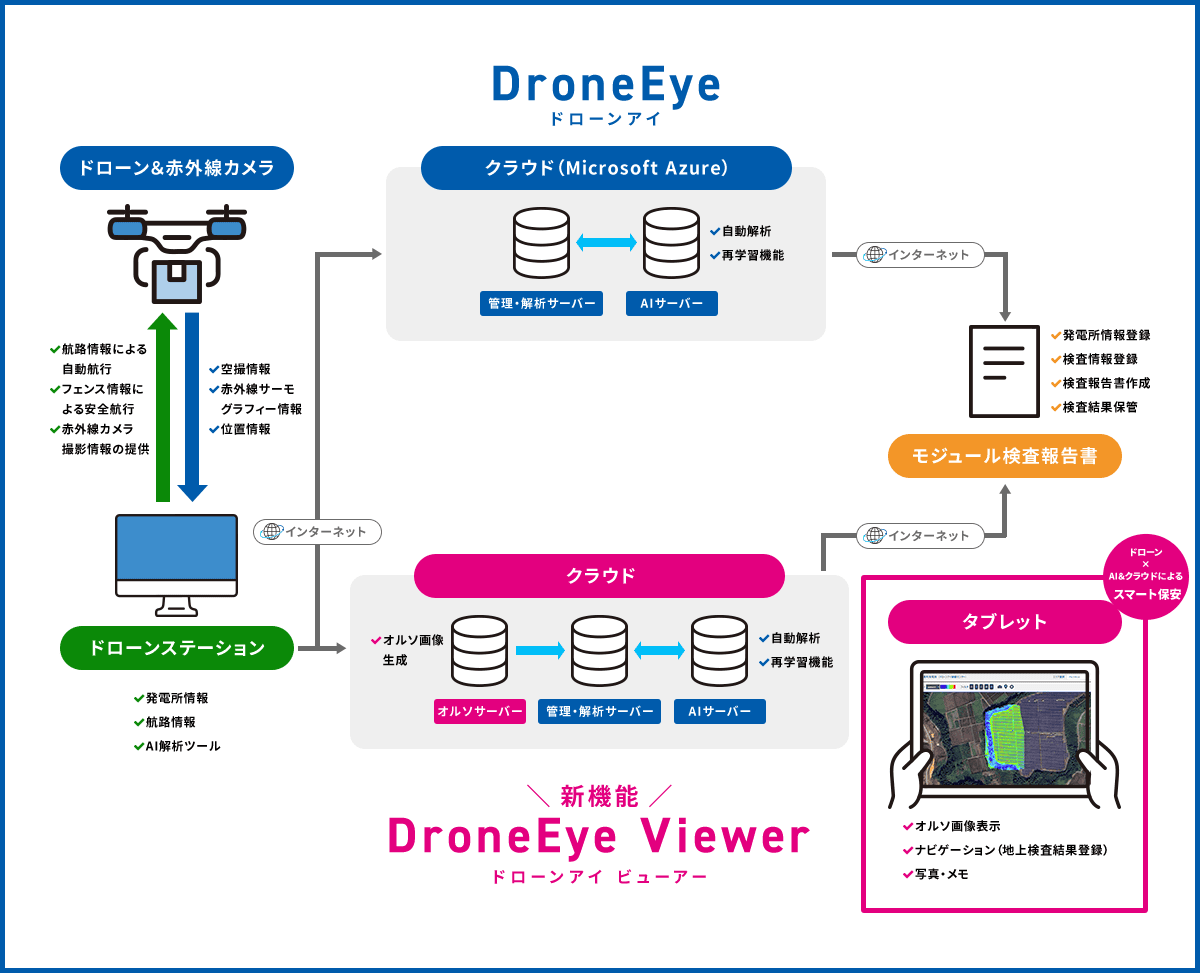 ドローンアイViewerは、ドローンで撮影した赤外線動画から高い解像度を維持しながら太陽光パネルのオルソマップを作成し、AIによる自動解析を行うことで高精度の検査結果をタブレット端末で確認することを可能にした新機能です。解析結果は個々の赤外画像を合成した位置情報を含んだオルソマップであるため、Googleマップ上に重ね合わせて表示でき、地図アプリのようにピンポイントの検査場所を簡単に確認することが可能です。