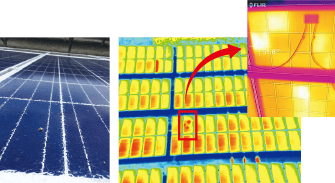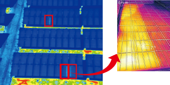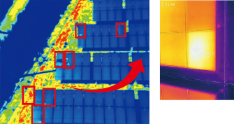 ドローンアイで赤外線画像と可視画像の撮影を行い、回路の断線や外圧によりクラックが発生したと思われる多数のモジュールを発見し、保険会社との交渉のエビデンスとすることができました。
