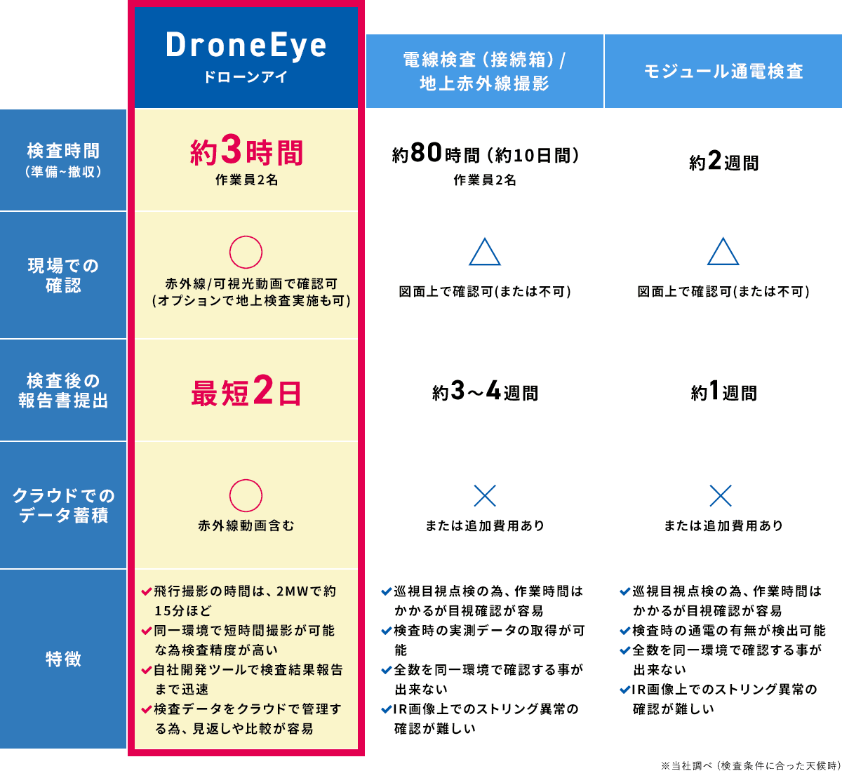 また、ドローンアイの検査結果をもとにした追加地上検査は通常1週間程度を要していた中、ドローンアイViewerを利用することにより、検査実施後最終報告書の自動作成まで2日程度で完了するため、作業効率が大幅に向上します。(20MW規模の場合)