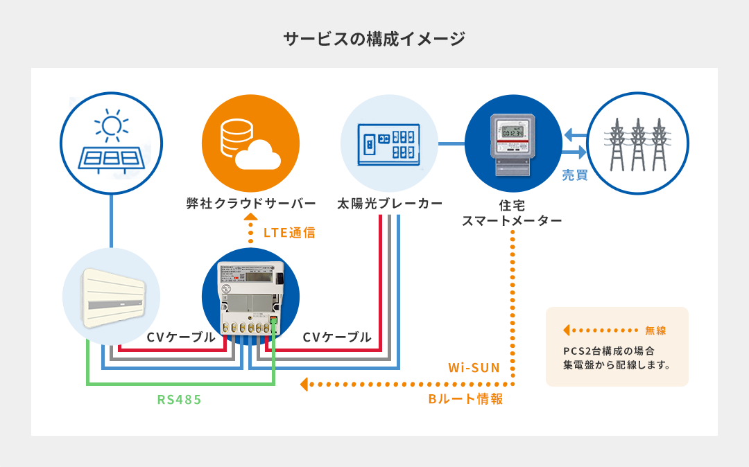太陽光の発電量だけでなく電力会社のスマートメーターから買電量、売電量をBルート取得することができるので、太陽光由来の自家消費量(課金対象電力量)の計測が1台で可能です。
