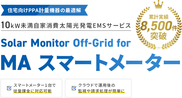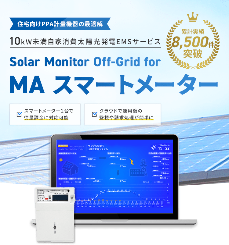 Solar Monitor Off-Grid for MAスマートメーターは住宅向けPPAに特化しているため、一般的な産業用EMSサービスと比較してリーズナブルかつシンプルな設計になっております。
